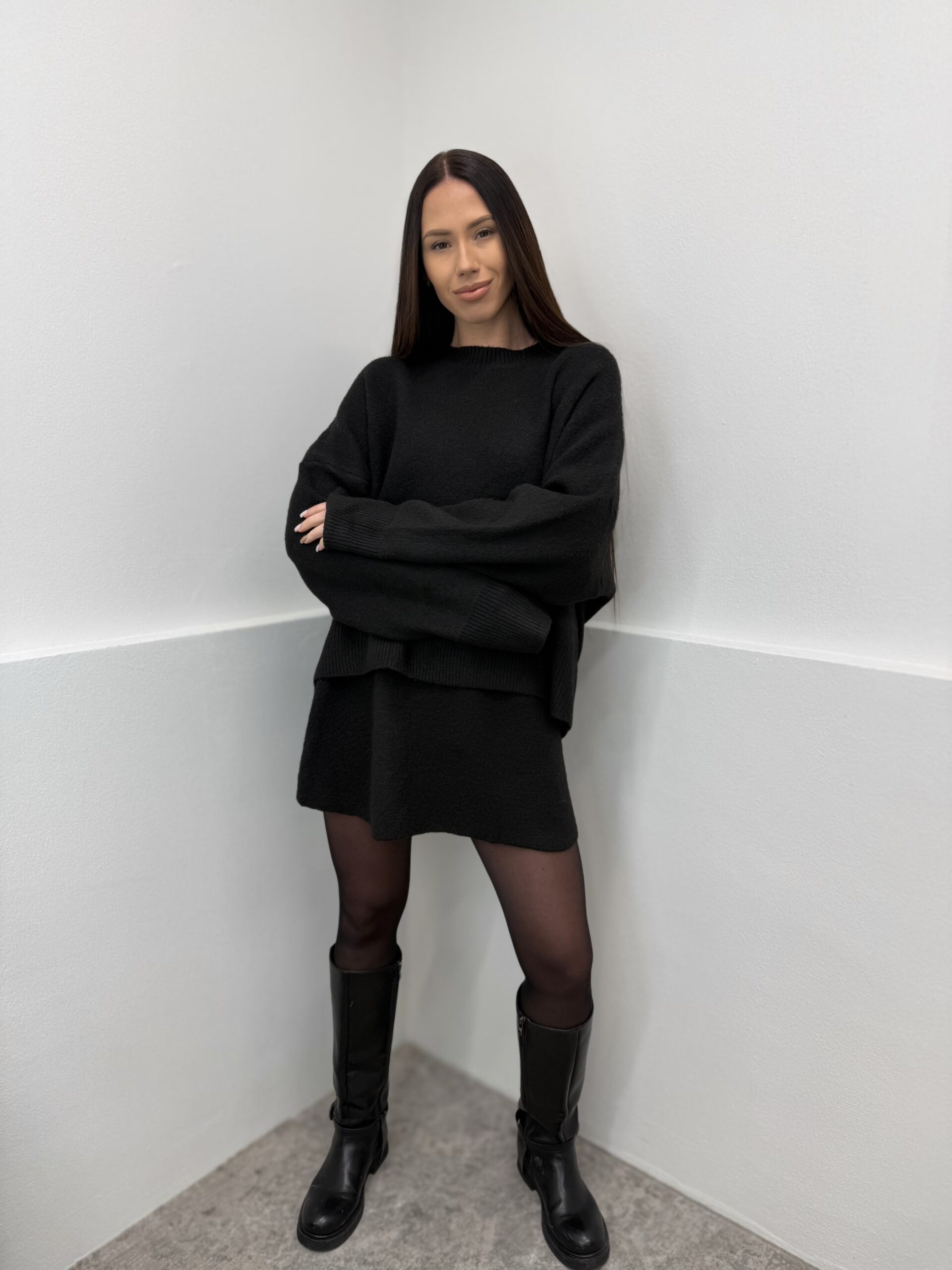 Megztas juodas komplektas su sijonu