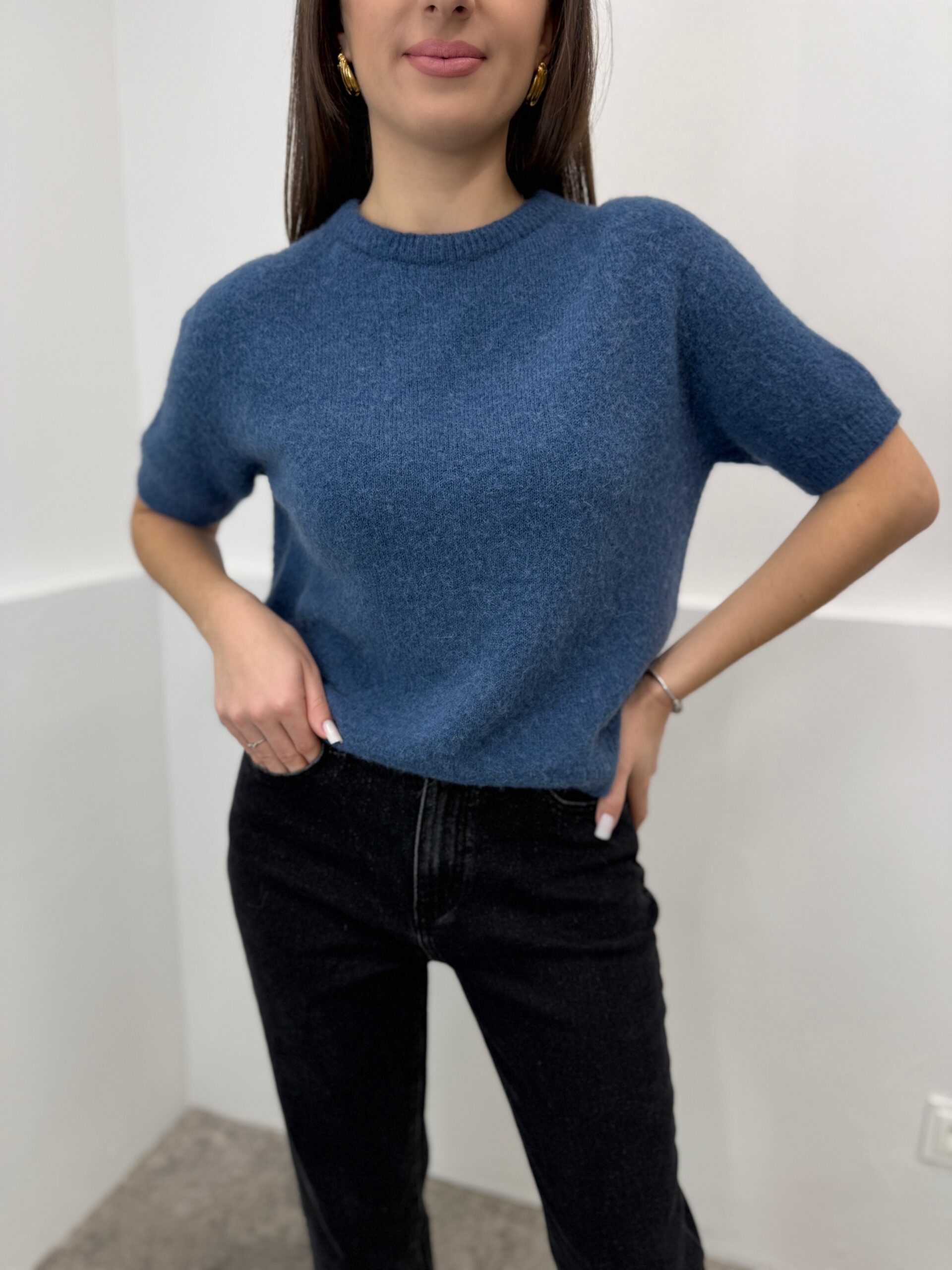 Mėlynas megztinis trumpomis rankovėmis su baby alpaca