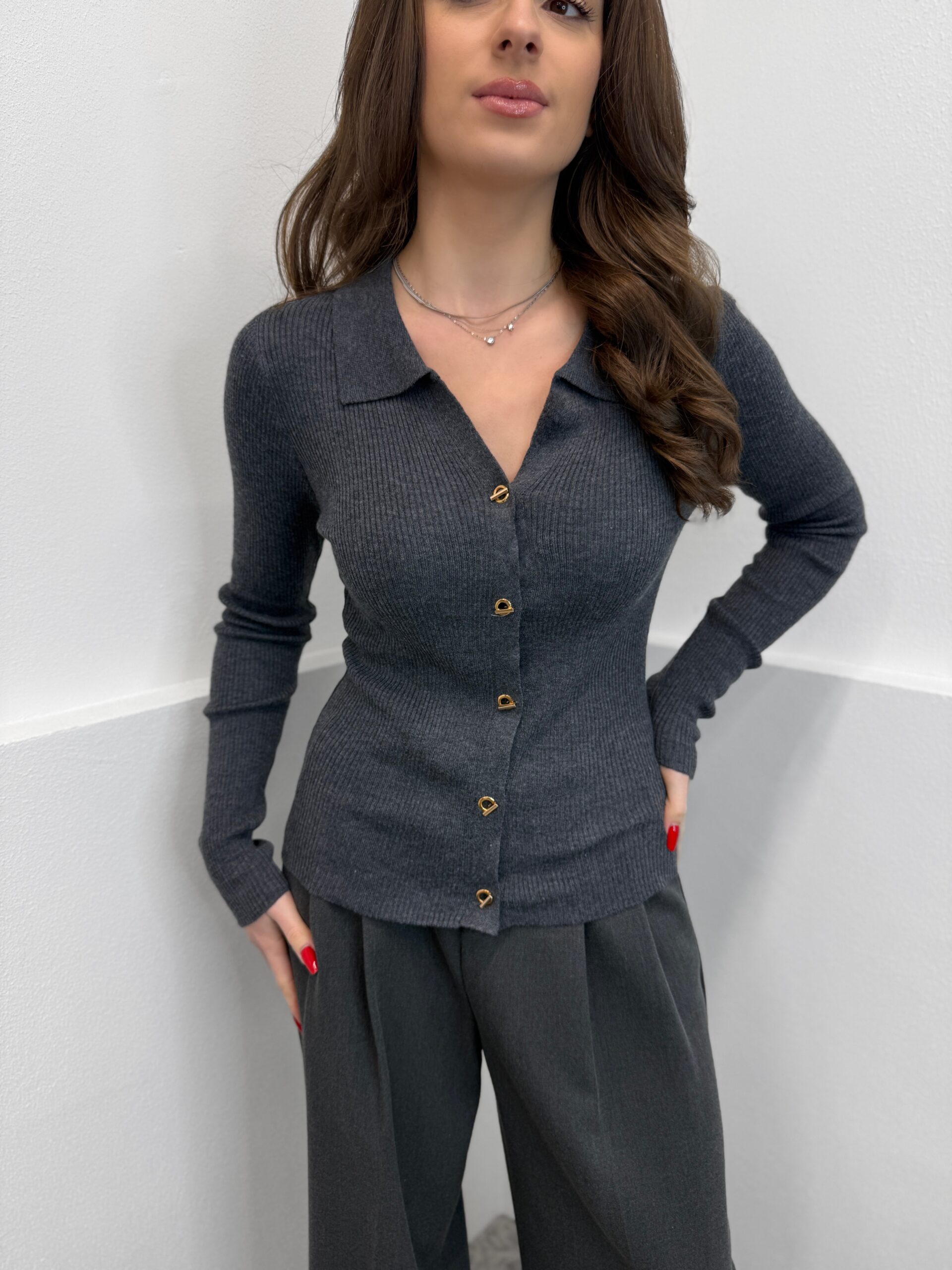 Pilkas megztinis su auksiniu susegimu