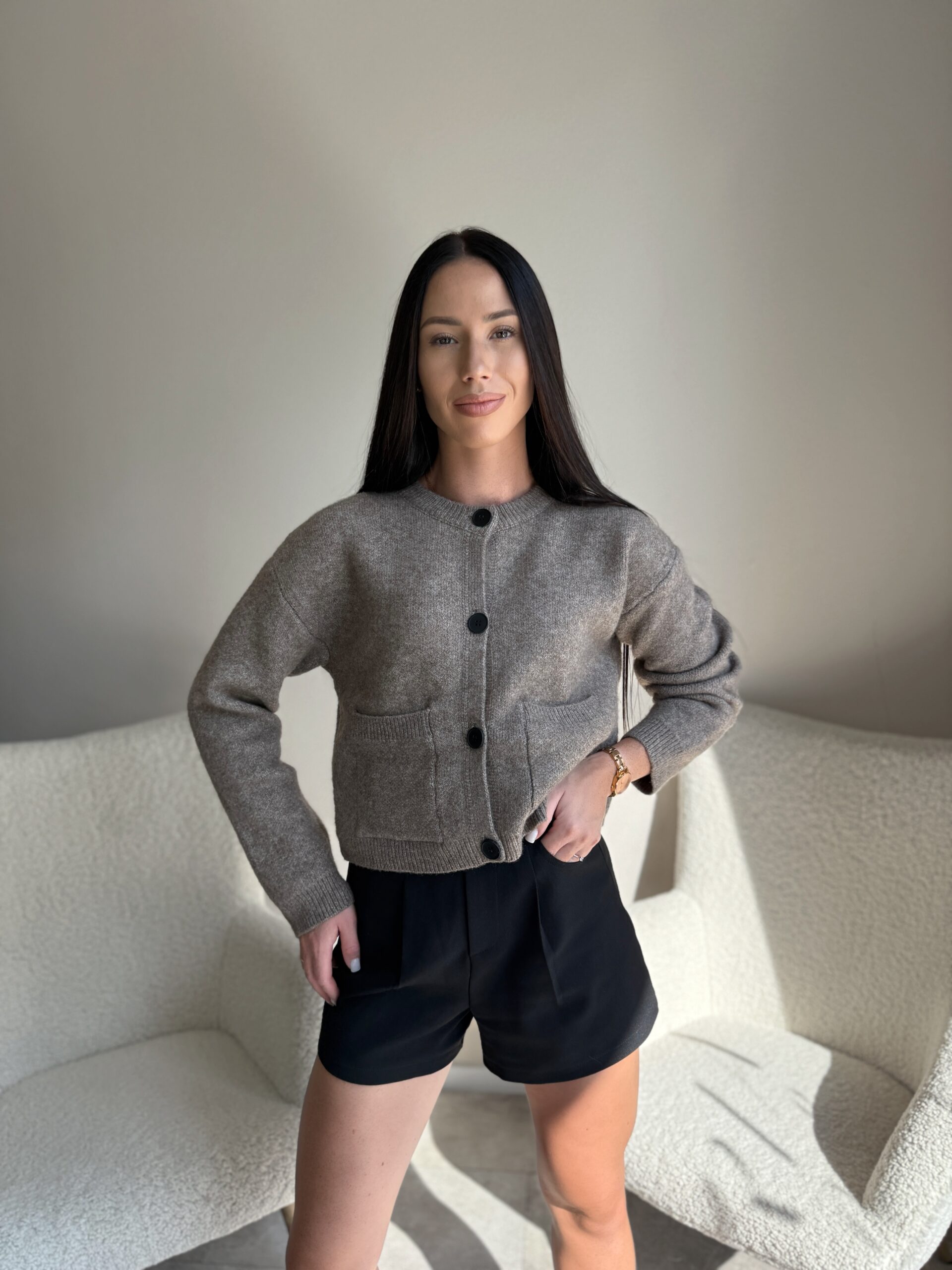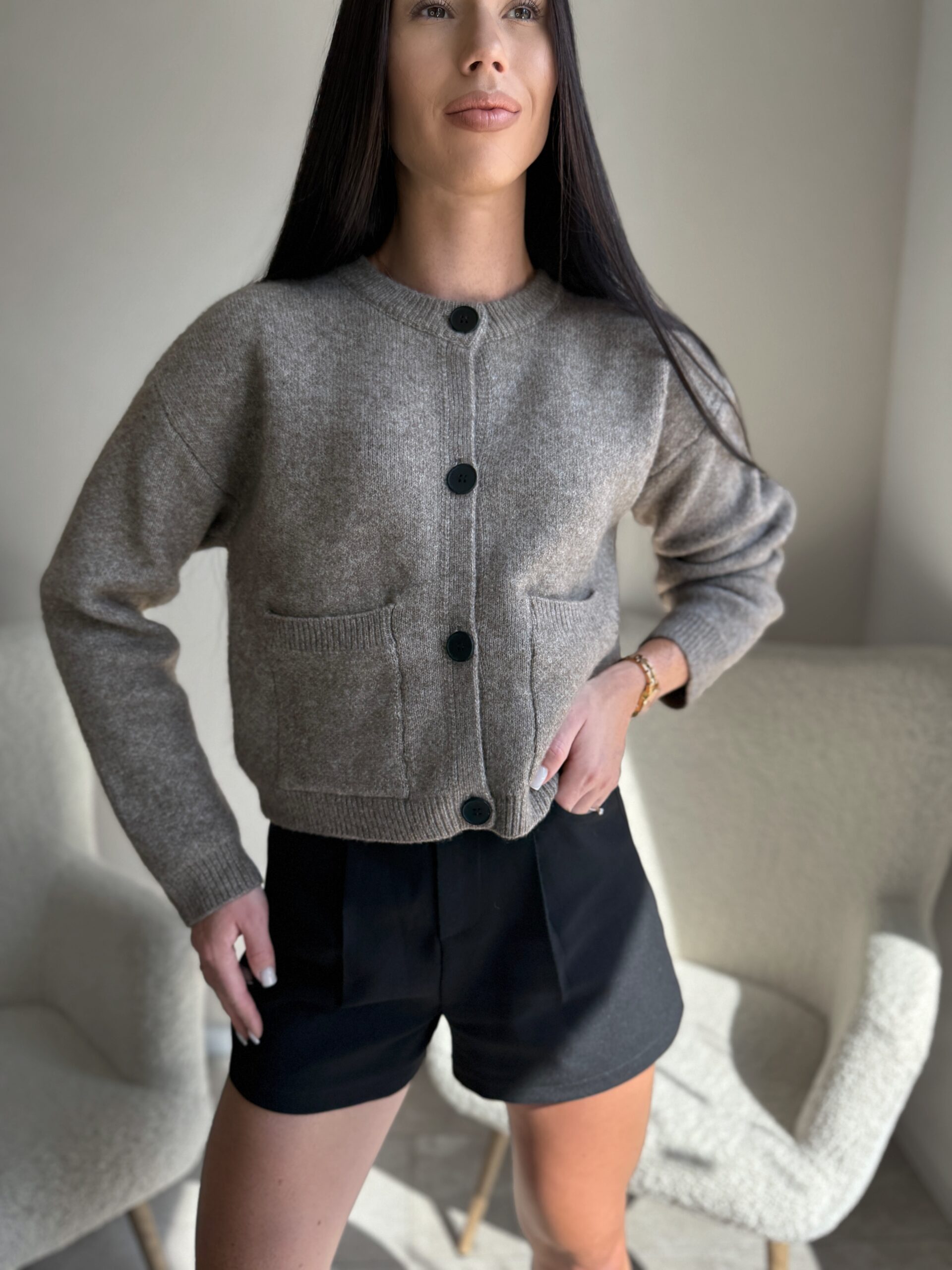Šiltas kardiganas juodomis sagomis Taupe