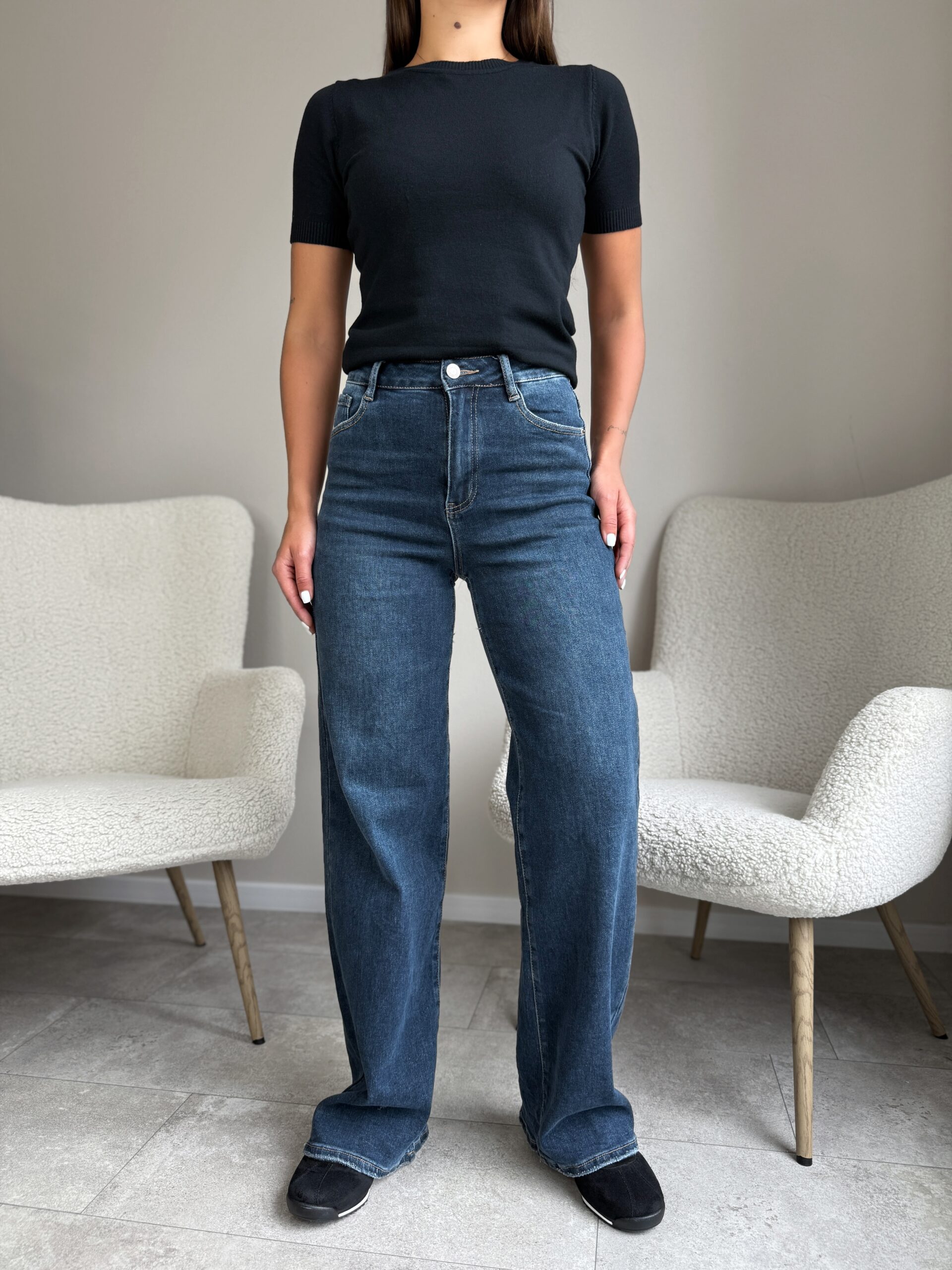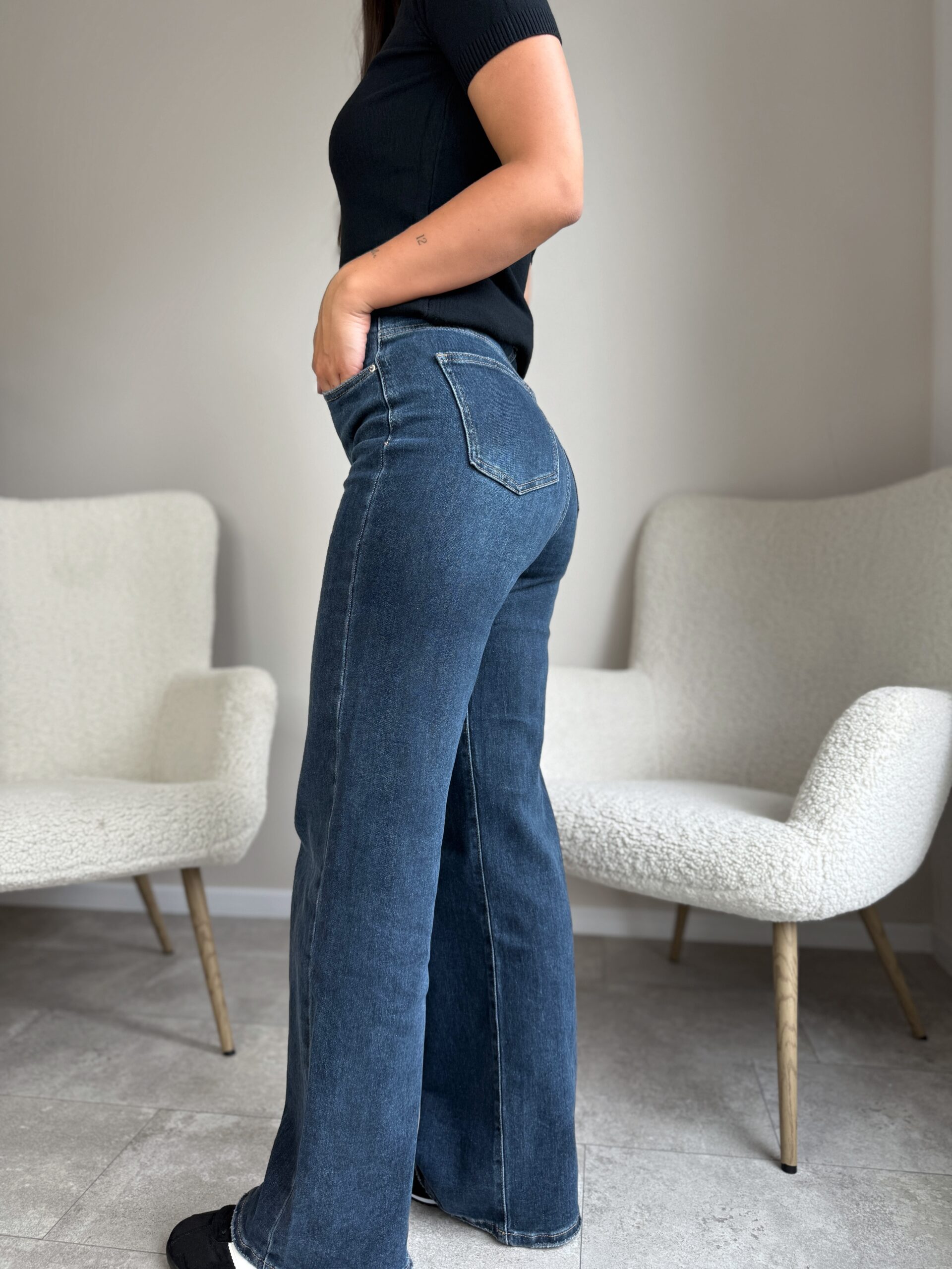 Tamprūs džinsai aukštas liemuo platėjantys